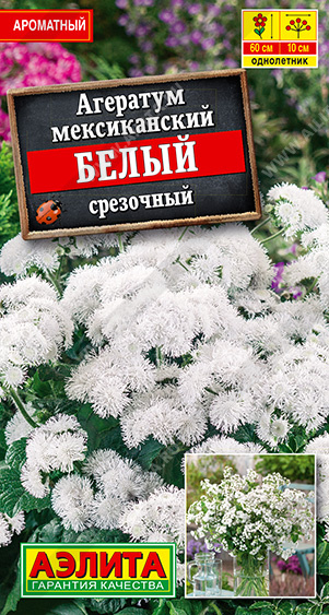 Длительное цветение, минимум ухода и обилие крупных соцветий – мечта садовода! Недаром в переводе агератум означает «нестареющий». Растение образует ветвистые кустики высотой до 60 см. Белоснежные, пушистые соцветия-корзинки диаметром 8-10 см венчают прочные побеги и великолепно освежают бархатистые листья. Агератум обладает тонким, стойким ароматом и отлично сохраняет свежесть срезки в букете. Сорт порадует пышным цветением до заморозков. Удачно войдет в состав высокорослых клумб и миксбордеров.
