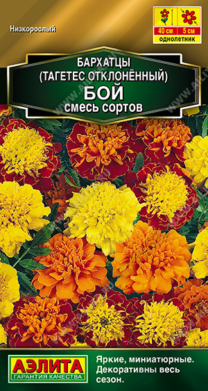 Россыпь ярких огоньков, которая оживит ваш сад, украсит балконы и окна! Главное достоинство этой смеси бархатцев иностранной селекции – это низкорослый кустик, высотой* 30-40 см, с сильным ветвлением и способнотью сохранять декоративность в течение всего сезона. Соцветия махровые, бархатистые, диаметром 4-5 см. Благодаря своей неприхотливости, бархатцы прекрасно растут в контейнерах, корзинах и оконных ящиках. Смесь великолепно подойдет для оформления клумб, бордюров, рабаток, подбивки более крупных растений.