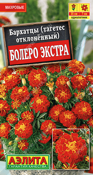 Бархатцы «Болеро Экстра» – яркие огоньки, которые оживят сад и сделают нескучной любую клумбу. Миниатюрные, компактные кустики (высотой* 25-35 см) в период цветения сплошь покрываются махровыми соцветиями (? 5-7 см). Окраска цветков очень необычная – красно-коричневая с небольшими вкраплениями золотисто-желтого. Растения очень неприхотливые, отличаются обильным и продолжительным цветением, оказывают санитарное воздействие на почву. Сорт великолепно подходит для оформления бордюров, клумб и для посадок в вазоны и балконные ящики.