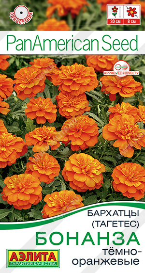 Бархатцы американской селекции Бонанза – абсолютный лидер продаж! За декоративные свойства удостоены международной награды. Сорт удивительно крупноцветковый для отклоненных (французских) бархатцев, цветки диаметром 5-8 см! Растения низкорослые, высотой 25-30 см. Кустики плотные, густые, компактные, зацветают рано. Отлично адаптируются к различным условиям выращивания. При этом сохраняют потрясающую «сочность» апельсинового оттенка соцветий и по-настоящему роскошное и пышное цветение. Это идеальное украшение садовых клумб в качестве ковровых посадок, а также находка для балконных контейнеров и горшков.