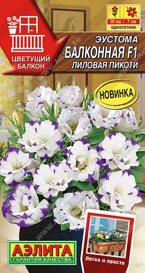 Балконная эустома, с изумительными по красоте нежными цветками, в средней полосе чаще выращивается в качестве однолетника. Компактная, низкорослая, высотой 20-30 см, хорошо ветвится, не перерастает и не требует формирования. Цветение начинается со второй половины лета, когда распускаются крупные розовидные цветки диаметром 5-7 см. Эустома хорошо растет в горшках и балконных ящиках, прекрасно смотрится в садовых вазонах. Осенью у растений обрезают побеги на 2/3 длины и помещают в теплое и светлое помещение, где при создании оптимальных условий они зацветут повторно. Для выращивания одного растения требуется горшок диаметром 20 см.