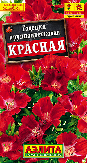Уникальный сорт с насыщенной окраской махровых, полумахровых и простых цветков диаметром 4-6 см. Они собраны в очаровательные пышные соцветия. Растения компактные, прямостоячие, высотой около 40-45 см, хорошо кустятся и обильно цветут. Особую декоративность цветкам придают нежные лепестки с атласным блеском. Годеция рекомендуется для оформления разнообразных смешанных садовых клумб, бордюров и контейнеров. Срезанные соцветия надолго сохраняют свежесть в букетах.