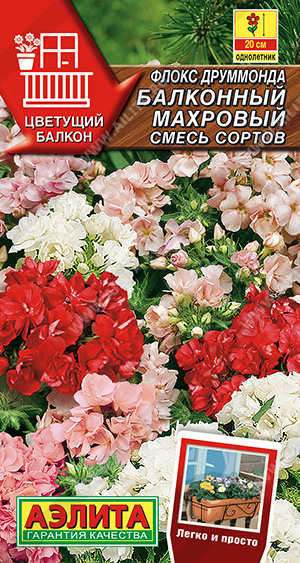 Компактная смесь однолетнего флокса с махровыми и полумахровыми цветками. Растения формируют кустики высотой до 20 см. Ароматные цветки ? 2-3 см, собраны в крупные соцветия и держатся высоко над листвой, образуя большой цветущий шар. Смесь идеально подходит длявыращивая в балконных ящиках и контейнерах (расстояние между растениями 15-20 см, для горшка ? 10-15 см достаточно 1 растения). Подходит для бордюров, цветников и садовых вазонов.