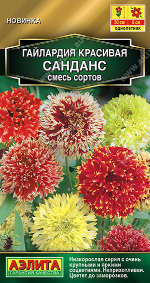 Новая серия низкорослой однолетней гайлардии Санданс (Sundance) европейской селекции. Высокоустойчива к капризам погоды. Неприхотлива и очень декоративна до осенних заморозков. На протяжении лета растения непрерывно образуют пышные махровые шаровидные соцветия ? 5-6 см. Компактные кустики высотой около 40-50 см эффектно выглядят при высадке группами в рабатках и бордюрах. Это великолепная срезочная и горшечная культура, надолго сохраняющая прекрасный облик.