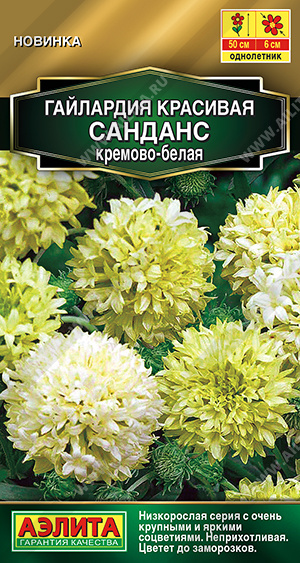 Новая серия низкорослой однолетней гайлардии Санданс (Sundance) европейской селекции. Высокоустойчива к капризам по годы. Неприхотлива и очень декоративна до осенних заморозков. На протяжении лета растения непрерывно образуют пышные махровые шаровидные соцветия ? 5-6 см. Компактные кустики высотой около 40- 50 см эффектно выглядят при высадке группами в рабатках и бордюрах. Это великолепная срезочная и горшечная культура, надолго сохраняющая прекрасный облик.