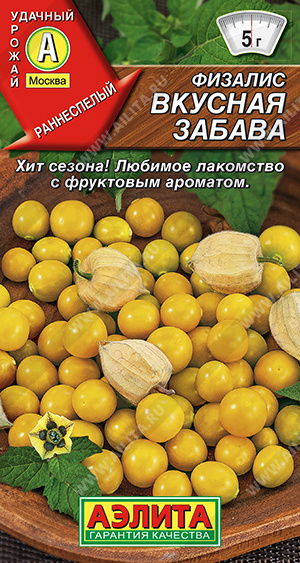 Лакомство для детей и взрослых! Сорт раннеспелый, неприхотливый и урожайный. Растения раскидистые, высотой 30-50 см в о/г. Бутоны закладываются через 1-2 листа. Начиная плодоносить на 92-99 день от всходов, они цветут до заморозков. Созревшие плоды падают в ладонь, едва к ним прикоснешься. Желтые блестящие «ягодки» массой 3-5 г очень вкусны; их аромат напоминает ананас или землянику. Вареньем из земляничного физалиса легко удивить родственников и друзей. Они ни за что не догадаются, из каких ягод оно сделано! Продуктивность: около 0,3-0,5 кг с растения.