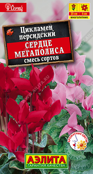 Роскошная и колоритная сортовая смесь цикламенов от чешской компании ?ern?. Растения образуют розетки декоративных листьев с возвышающимися над ними цветоносами высотой до 20 см. Цветки одиночные, яркие, крупные, ароматные, Ø 3-4 см. Цветение длительное, обильное, в течение холодного сезона. Летом растения находятся в состоянии покоя.