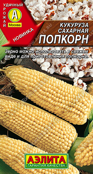 Специальный сорт кукурузы для легкого домашнего приготовления попкорна. Хорошо вызревает в условиях средней полосы. Среднеспелый: период от всходов до потребительской годности около 80-90 дней. Высота крепких растений может достигать 1,7-2 м. Початки плотные, средней массой до 170-200 г. Семена желтовато-белые, отличного вкуса, относятся к типу попкорн (лопающиеся при нагревании). Заготовку зерна для попкорна проводят при полном созревании початков на растении – это обеспечивает необходимый баланс влаги, белков и жиров. Сорт подходит для свежего потребления и варки.