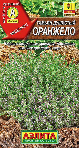 Очень редкий сорт тимьяна с неповторимым апельсиново-пряным ароматом. Растение многолетнее, широко известно так же как чабрец. Формирует сильноветвистые кустики высотой около 30 см, разрастающиеся в ширину. Молодые побеги с листьями периодически срезают и сушат. Их используют в кулинарии в качестве приправы, а также для приготовления полезного и вкусного чая. Тимьян прекрасно развивается в различных контейнерах на балконе или террасе. В саду можно выращивать вдоль дорожек и на каменистых горках. Отличный медонос, привлекает пчел и шмелей.