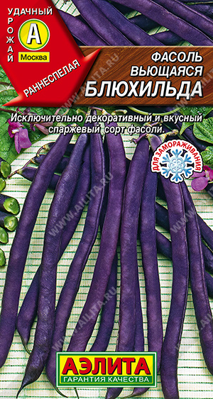 Раннеспелый спаржевый сорт. Плодоносит через 60-70 дней после всходов. Отличается отменной урожайностью в любом регионе. Бобы длиной 20-25 см, без пергаментного слоя и волокна, по мере созревания приобретают насыщенно-фиолетовый цвет. Растения объемные, с вьющимися побегами длиной до 1,5 м. Очень декоративны при посадке вокруг пергол и беседок благодаря необычным зелено-фиолетовым листьям. В пищу используются молодые бобы и семена. Прекрасный продукт для домашней кулинарии и консервирования (в т.ч. замораживания).