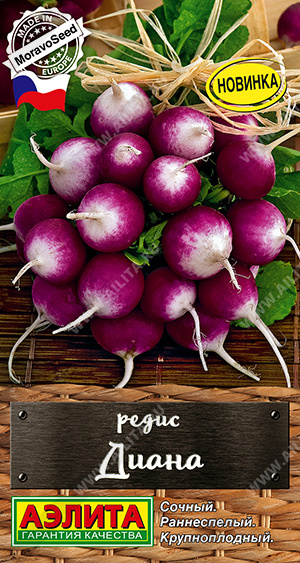 Раннеспелый, холодостойкий сорт редиса чешской селекции от компании MoravoSeed с крупными, двухцветными корнеплодами. Формирует урожай через 30-35 дней после посева. Подходит для выращивания в открытом грунте и под пленочными укрытиями. Корнеплоды округлые или удлиненно округлые, фиолетовые с белым кончиком. Средняя масса достигает 30-35 г. Сорт отличается высокой устойчивостью к цветушности. Найдет широкое применение в домашней кулинарии благодаря необычному цвету корнеплодов и вкуснейшей белоснежной мякоти.
