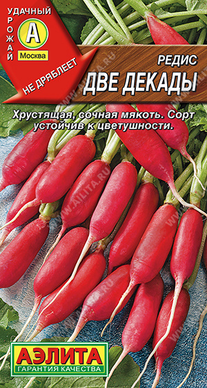 Высокоурожайный среднеспелый сорт. От всходов до потребительской спелости 25-27 дней. Для выращивания в открытом грунте и получения ранней продукции в защищенном. Корнеплоды массой 15-25 г, не растрескиваются. Мякоть плотная, хрустящая, сочная, приятного слабоострого вкуса. Рекомендуется для потребления в свежем виде и непродолжительного хранения. Сорт устойчив к дряблению корнеплодов и цветушности.