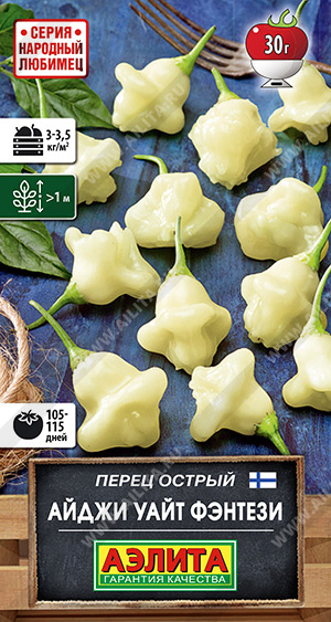 Знаменитый современный сорт из Финляндии, уже полюбившийся ценителям острого перца по всему миру. Известен гурманам как Aji Fantasy Sparkly White. По сравнению со своим прародителем – желтым перцем-чили Aji Fantasy – он отличается фантастической продуктивностью (до 100 перчиков c куста!), более толстой (3-4 мм) и сочной мякотью, сбалансированной мягкой остротой (при этом семена очень острые), сладковатым вкусом и фруктовым ароматом. Куст раскидистый, крепкий, высотой в теплице более 1 м. Плоды массой 25-30 г созревают рано, через 105-115 дней от всходов. Очень полезны для здоровья, их следует употреблять в свежем виде, мариновать и сушить впрок.
