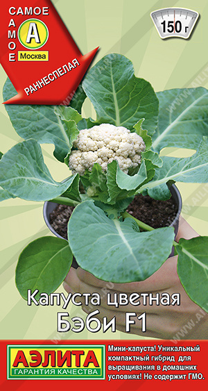 Огород на подоконнике! Свежие соцветия сразу в тарелку! Высота растения составляет 20 см, ширина куста – 25 см. Период от посева до технической спелости 75-85 дней. Для одного расрения достаточно горшка ? 12-13 см, при этом масса соцветия капусты составит 50-70 г. При выращивании гибрида в открытом грунте – до 130-150 г. Соцветие белоснежное, плотное, не требует укрытия от солнечных лучей. В пищу рекомендуется употреблять не только сладкие соцветия, но и нежные листья. Очаровательные мини-соцветия идеальны для запекания, тушения, маринования, а также для употребления в свежем виде в салатах.