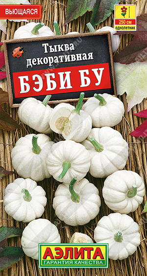 Миниатюрная декоративная тыква. Период вегетации около 100 дней. На каждом растении образуется более 10 маленьких тыковок. Плоды слаборебристые, с гладкой корой и белой мякотью, массой 200-300 г. Плети вырастают более 2,5 м в длину, поэтому сорт прекрасно подойдет для украшения беседок и заборов. Зрелые плоды долго сохраняют декоративность и будут служить прекрасным украшением интерьера.