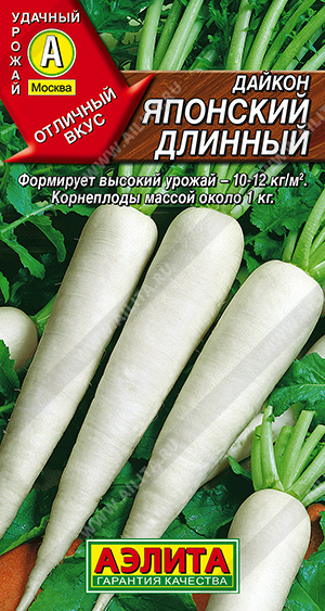 Крупноплодный сорт, один из самых урожайных и вкусных! От появления всходов до начала потребительской спелости проходит 55-70 дней. Корнеплоды гладкие, с белой кожицей, длиной до 30-40 см, массой около 1 кг. Погружены в почву на 1/3-1/2 длины. Мякоть очень сочная, нежная, белая; сладковатого вкуса – без резкого редечного привкуса. У более молодых корнеплодов вкусовые качества выше. Самая сладкая их часть – в середине. Дайкон хорошо сочетается в салатах с разными овощами и даже фруктами. Урожайность: около 10-12 кг/м2.